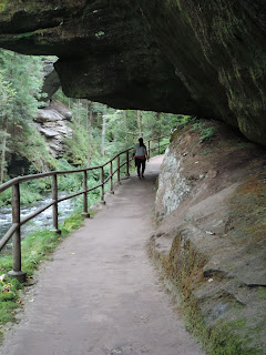 The sandstone overhangs and sheer walls were covered in moss, lichen, and trees (they grow in the water absorbed by the sandstone). There were also plenty of ferns along the path and long waves of grass growing in the river. The trail ended when the canyon walls rose directly from the river. Here they offer a boat service through the canyon, the boat being propelled by poling. After the boat ride we continued along the gorge returning to Hřensko.